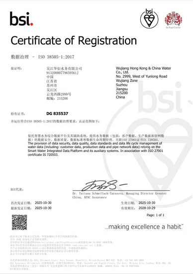10月30日,吴江华衍水务有限公司正式获得英国标准协会(BSI)颁发的数据治理管理体系认证证书,标志着该公司在数据治理与数字化管理方面已达到国际通用标准,为企业高质量发展注入新动能。